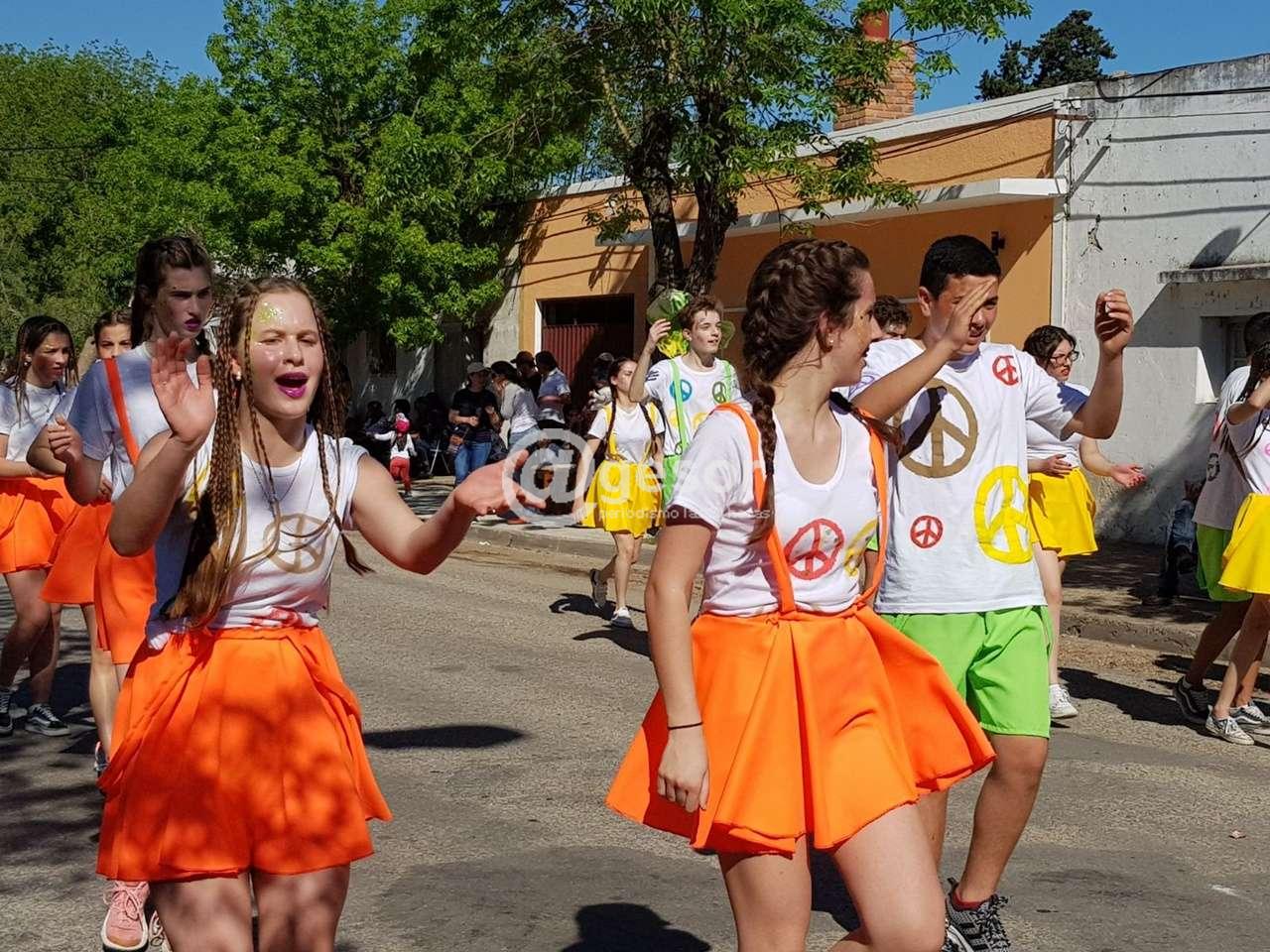 Carroza Nº 5, de 3º1 y 3º3 “La mejor arma para la paz es la educación”. Mensaje: “Un ser humano preparado, será capaz de edificar un mundo de paz. La educación nos marca el camino. Digamos no a las guerras, las bombas, los misiles, paremos la destrucción de nuestro planeta, sembremos árboles y flores, dejemos que el sol y la lluvia siga llenando nuestra tierra de primavera. Por eso hoy, los invitamos a continuar, lean, piensen, construyan, reciclen, ayuden, tiendan sus manos y juntos construiremos el mundo que soñamos.”
