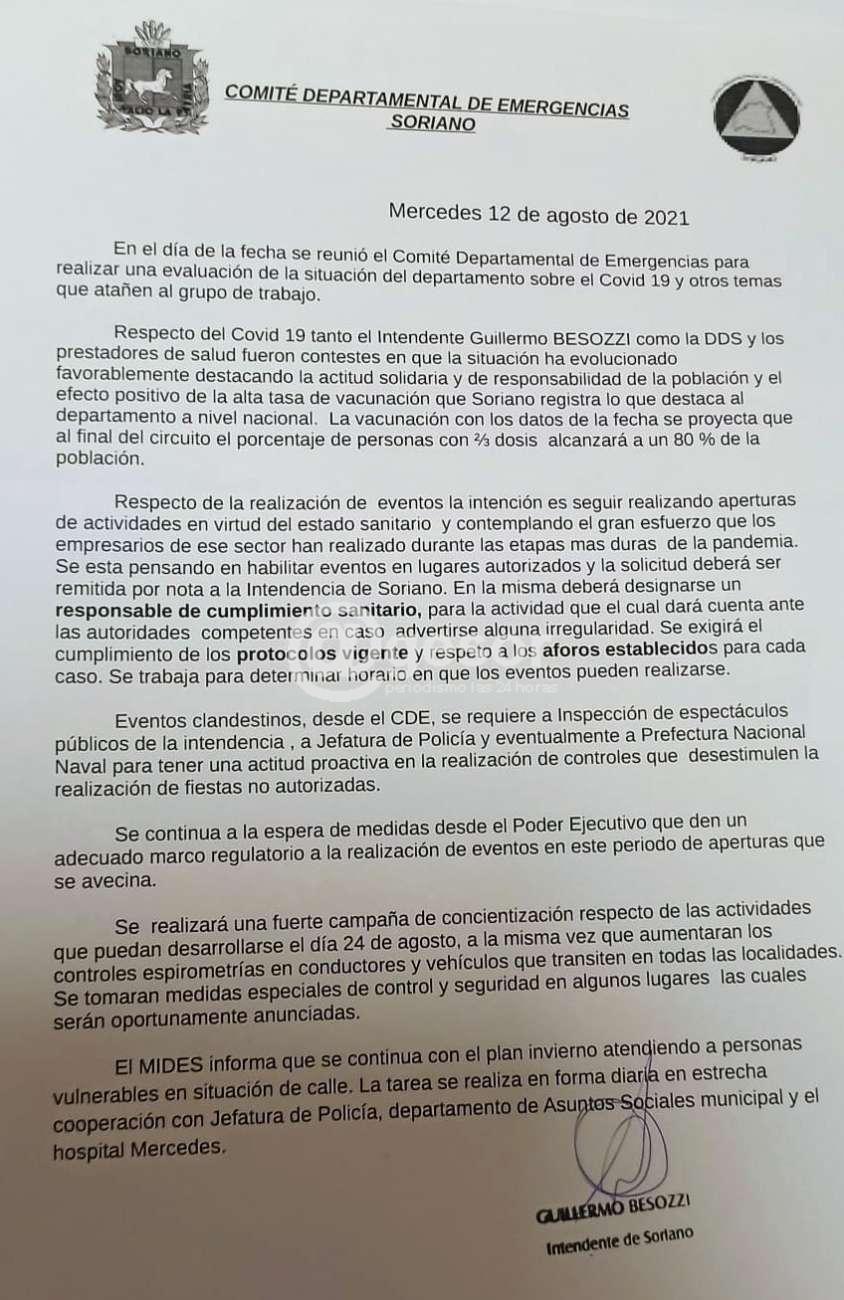 Se reunió el Comité Departamental de Emergencias evaluando la situación sanitaria del departamento. Una reunión en la que si bien no hubo mayores novedades se adelantó que se comenzará a realizar una fuerte campaña de concientización de cara al próximo 24 de agosto cuando se celebre la Noche de la nostalgia donde se espera que aumente la movilidad de las personas.