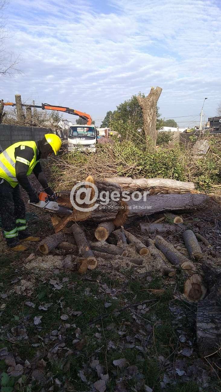 Personal del municipio de Dolores operando una grúa apropiada procedió al retiro de varios álamos carolinos de casi 30 metros de altura que estaban ubicados en el predio posterior de Las Tunitas Bochas Club y en un terreno lindero perteneciente a un vecino de la institución.