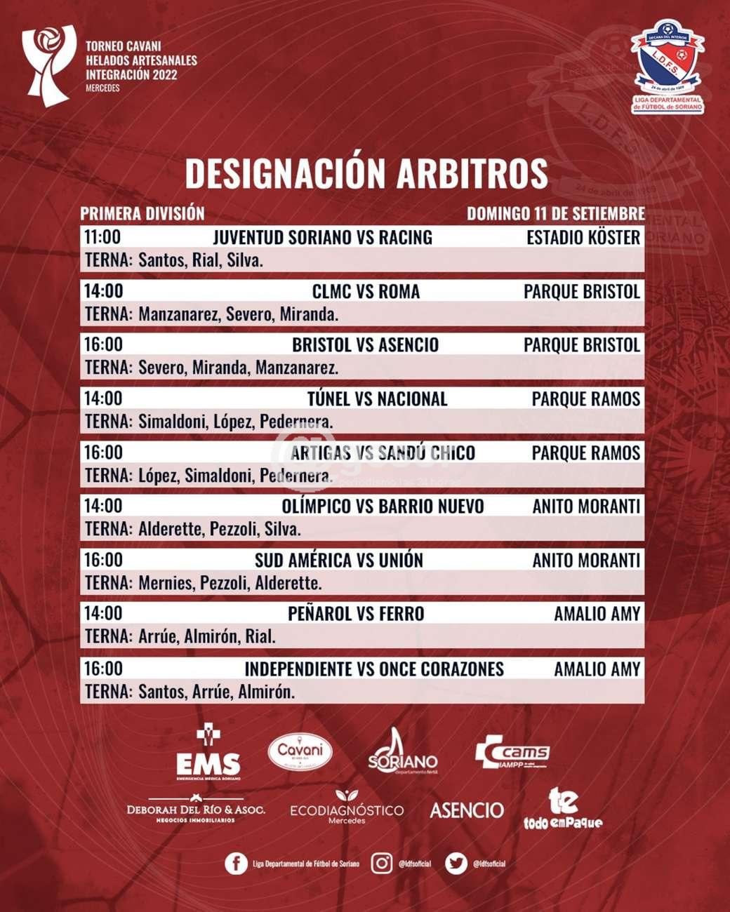 En tanto que el encuentro que será televisado el domingo en la mañana desde las 11.00 horas en el estadio "Luis Köster", entre Juventud Soriano y Racing tendrá la terna de Santos, Rial y Silva.