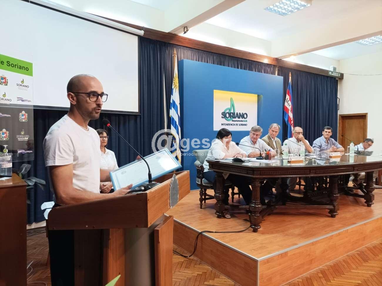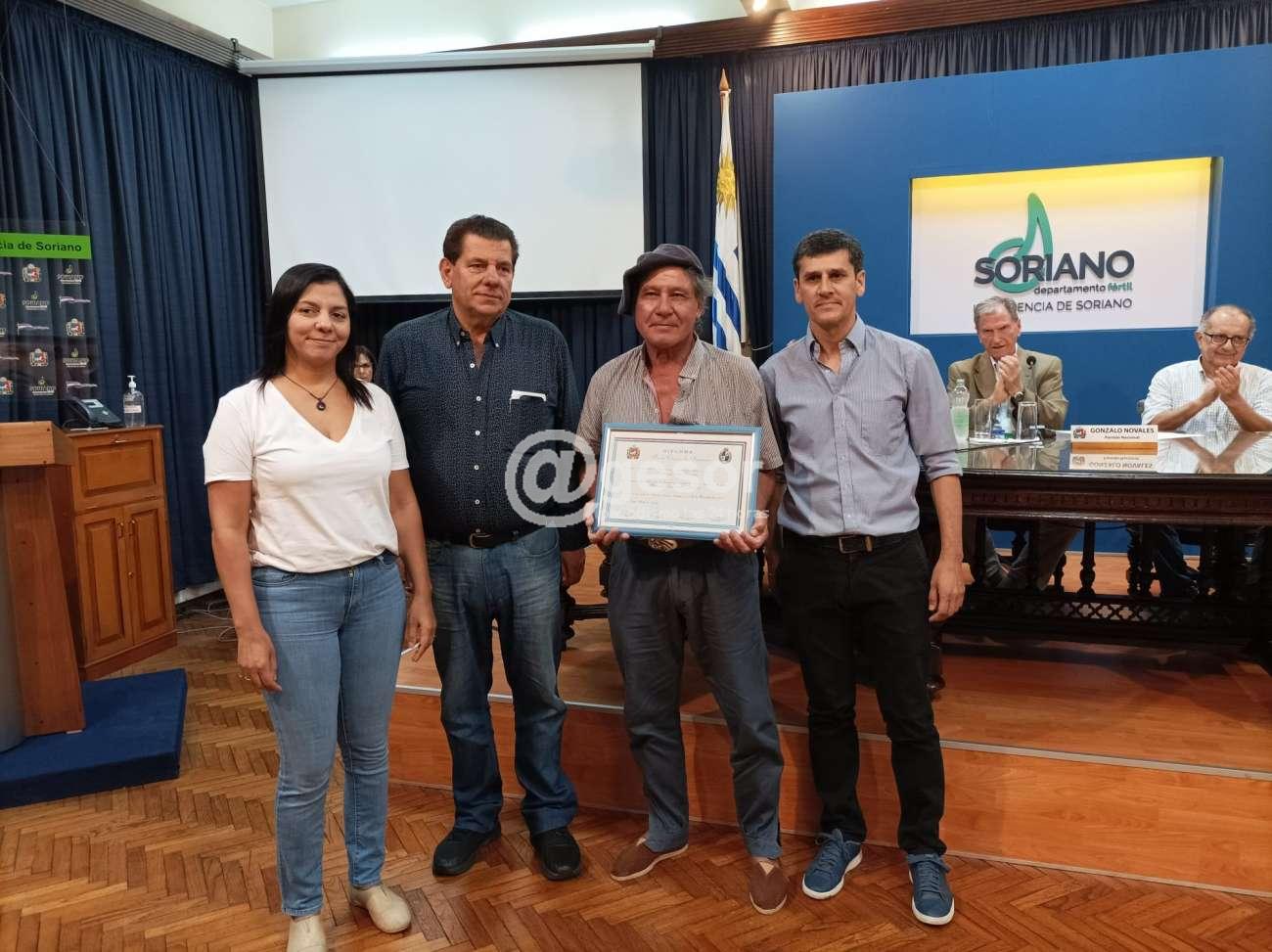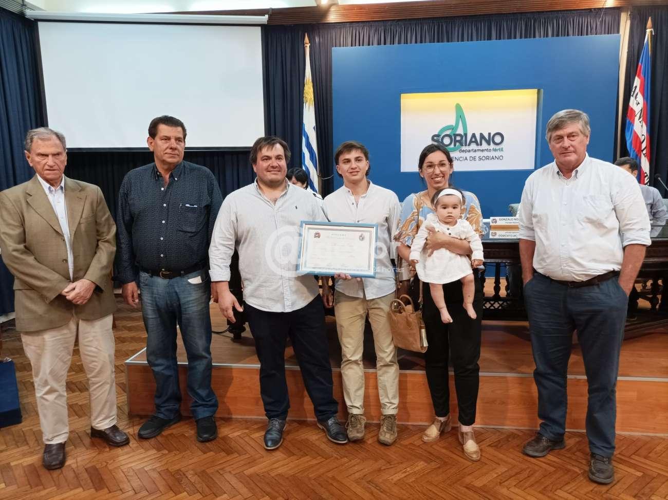 Entregó el Diploma el Edil Bruno junto al Presidente de la Junta Departamental Gonzalo Novales y al Intendente de Soriano, Guillermo Besozzi, recibiéndolo Damián García junto a esposa e hijos.