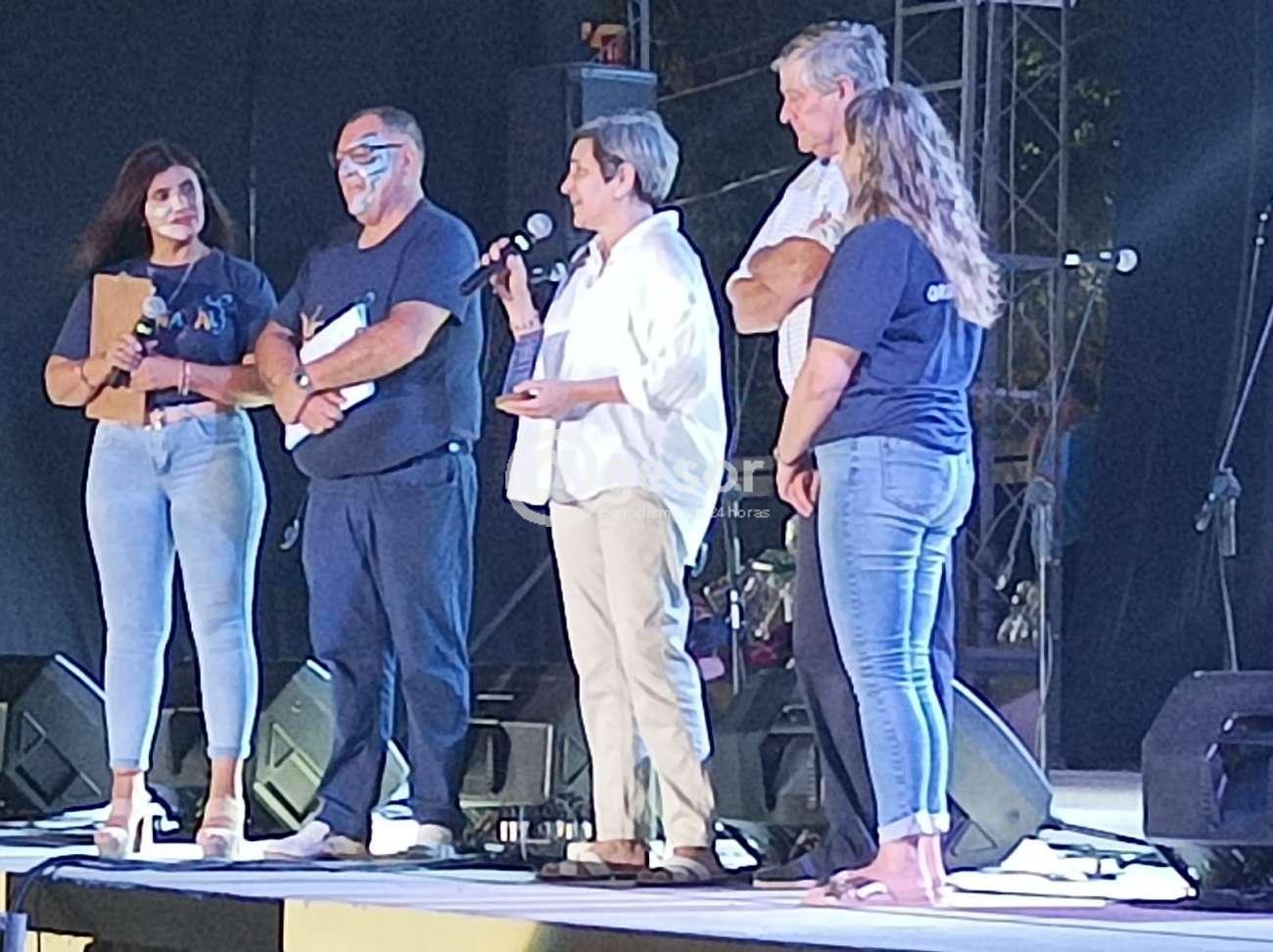 Por un lado a una persona que está entre nosotros y vale aquello de los reconocimientos en vida, nos referimos a Miguel Acquistapacce, hoy a los 83 años sabemos que concurre a los espectáculos en Manzana 20 pero su humildad y forma de ser le impidieron subir al escenario, agradeció a integrantes de la organización el reconocimiento, pero lo recibió simbólicamente la Edila Mayka Acuña y luego sabemos que lo entregaron en manos de la hija de Miguel, Graciela.