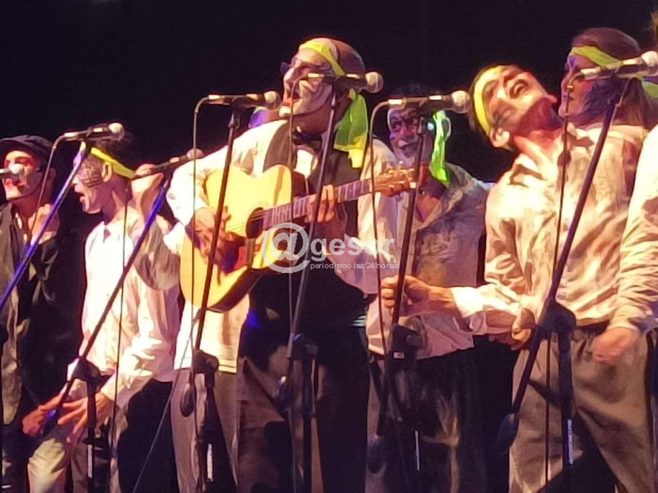 Y desde el comienzo hasta el final la murga canta y canta, con una musicalidad muy variada, precisamente donde se ve la mano de Velando, con un hilo conductor muy bien llevado por Federico Hado, con solvencia y sin necesidad de largas intervenciones, lo mínimo para el énfasis del cambio de la murga, que va pasando por diferentes etapas de críticas, y si se pensaba que podía ser un "panfleto" partidario, en el escenario nada que ver, la crítica fue la justa y lógica a la altura de cualquier conjunto, quizás con un énfasis diferentes en la interpretacion porque en definitiva allí está el trabajo de diferencia a unos y otros. la comunicación con el público se dio desde los primeros minutos tras un silencio inicial para ver como empezaba y cuando abrieron la boca para que escucháramos un coro potente, afinado, una murga sin baches innecesarios, cada uno rindiendo en lo suyo, solos, dúos, tríos.