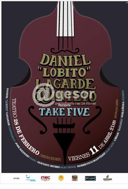 Este viernes 11, a las 21 horas, en Teatro 28 de Febrero se presenta Daniel "Lobito" Lagarde en Quinteto para presentar "Take Five". El espectáculo es auspiciado por el Movimiento Jazz a la Calle, los Centros MEC de Soriano, y la Dirección de Cultura de la Intendencia de Soriano, y serán con entrada libre y gratuita.