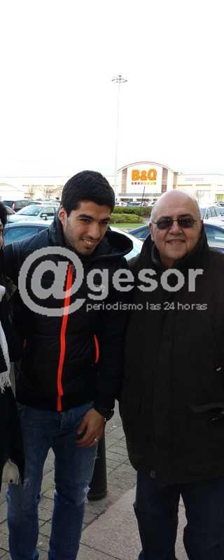Llegado febrero y ya en Inglaterra escribo y ahí si, con la firma de Luis Suárez, me pide mi número de celular para comunicarse conmigo cerca de la fecha del encuentro. Tenia ya contratado un tour, para dos días antes del partido, por el estadio, y pensé que podría ser una buena oportunidad de estar con él y sacarnos fotos, se lo comunico y quedamos en eso, el hecho que ese dia en Anfield había casi 1500 personas haciendo tours, por lo que para él era imposible concurrir, los tours en el estadio recorren desde las salas de sesiones, vestuarios (donde está la indumentaria de cada jugador), sala de prensa, masajes, charlas previas y la salida a la cancha (que no dejan pisar) pero si recorrer su entorno y tener acceso a las instalaciones de todo el estadio. Las fotos con Luis, pensé no se realizarían. Es de hacer notar en forma anecdótica, que cada vez que Luis me llamaba, lo hacía como si me conociera de toda la vida, y nunca nos habíamos visto, "Oscar, mirá que hoy no puedo, mañana te llamo", etc, quedamos de encontrarnos el sábado previo al partido para unas fotos, previo decirle que en la tarde tenía un tour Beatle, pero que no tenia problemas en cortarlo (ya la ilusión de ver al idolo de Liverpool habia pasado en mi a primer plano) y asi fue, en pleno tour suena mi teléfono y el "hola Oscar soy luis", ya me era conocido, ubicados por donde estábamos quedamos en 5 minutos de encontrarnos en un centro comercial, hubo que cambiar cuatro veces el lugar de encuentro porque los fans ya se habían percatado de su presencia. Concretado el encuentro, abrazos, besos y charla como si siempre nos hubiéramos conocido, la humildad de Luis no tiene limite, es increible que el mayor goleador de la Premier League, estuviera frente a mi charlando y tomando mate como un amigo más, pero en pleno Liverpool, pidiendo disculpas por el poco tiempo que disponia y la poca privacidad que en la ciudad tenia ya que lugar que concurria, sus fans lo seguían y hacian casi imposible su vida privada. Pese a eso su señora e hijos estuvieron junto a nosotros como si fuera un encuentro de amigos de siempre. Ya cuando la cantidad de gente que se habia acercado al verlo hizo casi imposible la charla, y una vez más disculpándose fue hasta su camioneta y bajó con entradas y una bufanda con su foto como regalo hacia nosotros, cuando en realidad el regalo más grande había sido el compartir con él esos minutos robados a su vida de familia y dedicada a quienes por primera vez en su vida nos veía. Quienes opinen, por su forma de ser, analizar u opinar de cómo es la persona de Luis, jamás pueden imaginarse sin estar con él, que es Un SEÑOR con mayúscula, de los más grandes jugadores que nuestro país ha dado al mundo, posea la humildad y don de gentes, este salteño, que hace erizar, cuando cualquier ciudadano identifica a un uruguayo, lo primero que nos dice "¿Suárez? Genio¡¡¡ "