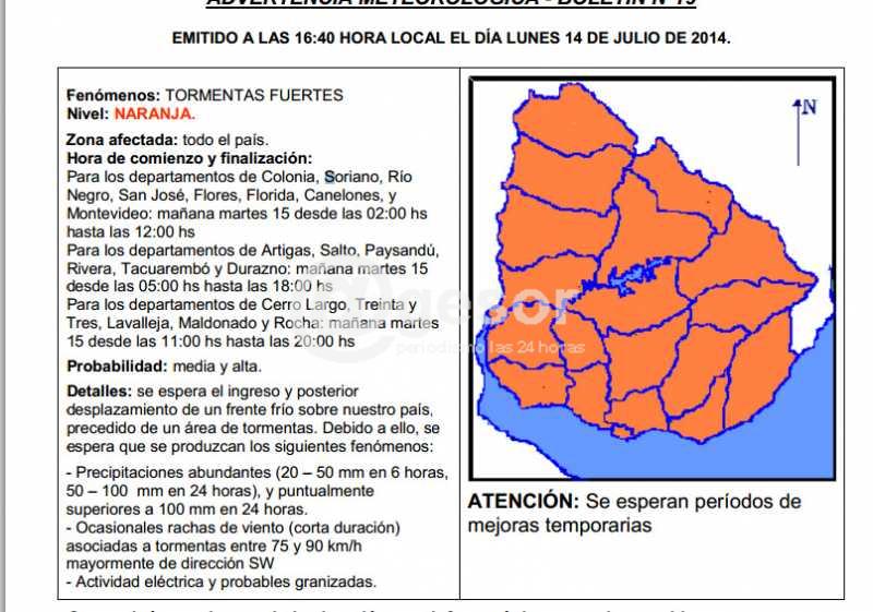 Para los departamentos de Colonia, Soriano, Río Negro, San José, Flores, Florida, Canelones, y Montevideo el llamado de atención tendrá vigencia desde las 02:00 hs hasta las 12:00 hs. de este martes 15 de julio.
