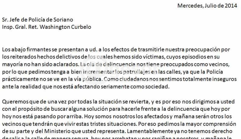 Los abajo firmantes se presentan a ud. a los efectos de trasmitirle nuestra preocupación por los reiterados hechos delictivos de los cuales hemos sido víctimas, cuyos episodios en su mayoría no han sido aclarados. La ola de delincuencia nos tiene preocupados como vecinos, por lo que pedimos tenga a bien incrementar los patrullajes en las calles, ya que la Policía prácticamente no se ve en la vía pública. Como ciudadanos nos sentimos totalmente inseguros ante la realidad que nos está afectando seriamente como sociedad.