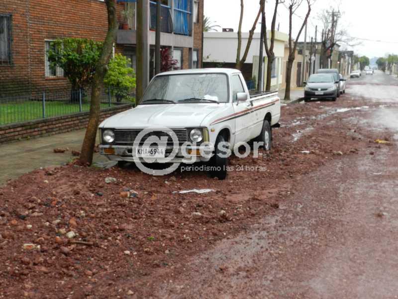 Debido a las intensas lluvias que están ocurriendo en Mercedes desde el sábado, este domingo pudo apreciarse importante erosión causada en las dos cuadras de Varela desde Blanes Viale a Don Bosco que están construyéndose a nuevo por parte de la comuna.