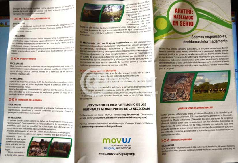 "En una muy costosa campaña publicitaria, la empresa trasnacional Zamin Ferrous, conocida como Aratirí, difundió por la prensa un folleto donde pretende justificar su proyecto para la extracción de hierro a cielo abierto en nuestro país. Distorsiona de tal forma la información que, como simples ciudadanos, elaboramos este material para poner en evidencia la falta de seriedad técnica y la poca confiabilidad de la empresa. Te invitamos a leerlo con atención. ¡Una decisión mal informada puede tener costos irreversibles para el Uruguay!