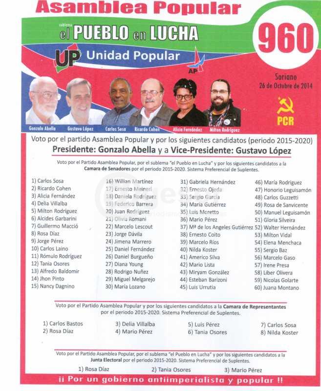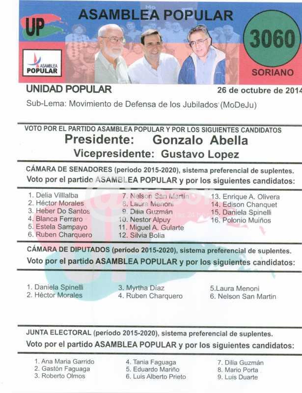 Asamblea Popular en Soriano presenta cinco opciones electorales a través de las listas 326, 960, 1969, 3060 y 13013, encabezadas por la fórmula Gonzalo Abella - Gustavo López y los cinco candidatos a diputado son Raúl Perdomo, Carlos Bastos, Lorena Casco, Daniela Spinelli y Horacio Zefferino. Adjuntas ofrecemas las dos hojas de votación.