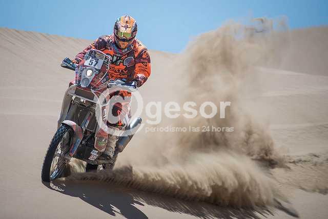 Ha tenido muchas experiencias pero nunca lo que le sucedió hoy donde tuvo el susto de su vida “Cuando comenzaba en una bajada de una de las tantas dunas tengo una caída boba, me levanto rápidamente y pongo la alarma que avisa a otro competidor que hay una moto caída y que tengan cuidado. En el momento que la coloco siento un ruido que viene de arriba y sale un camión Kamaz que se me viene encima. Le vi la cara del piloto que se sorprendía, pero al ser bajada y arena el camión seguía bajando. Yo que veía venir esa mole cada vez más cerca de mí, pero por suerte paró a menos de un metro. Prendí la moto y me fui. El corazón me quedó palpitando como media hora. Fue el susto de mi vida”.