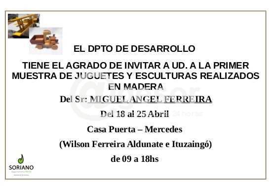 Del 18 al 25 de abril en Casapuerta se realizará una exposición de juguetes y esculturas en Madera. Su autor es Miguel Angel Ferreira. El Departamento de Desarrollo de la Intendencia de Soriano promueve esta actividad. La muestra permanecerá abierta en en un amplio horario, de 9 a 18 horas, en Casapuerta (Wilson Ferreira Aldunate e Ituzaingó, Mercedes).