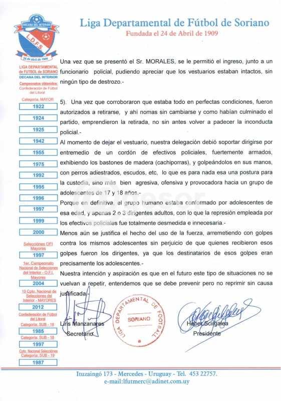 En la sesión semanal de la Liga Departamental de Fútbol de Soriano, se dio a conocer el texto de la denuncia que ésta enviará a la Jefatura de Policía de Salto denunciando abuso de autoridad por parte de funcionarios de esa dependencia del Ministerio del Interior en perjuicio de la delegación de Soriano Capital (Mercedes) que disputara semifinal de la Copa de Selecciones Sub 18 de la OFI ante el equipo local en el estadio "Ernesto Dickinson".