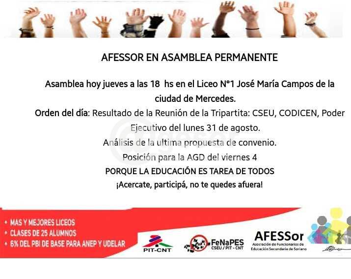 AFESSOR EN ASAMBLEA PERMANENTE. Este jueves se realizará una Asamblea a las 18:00 horas en el Liceo N°1 de Mercedes.
