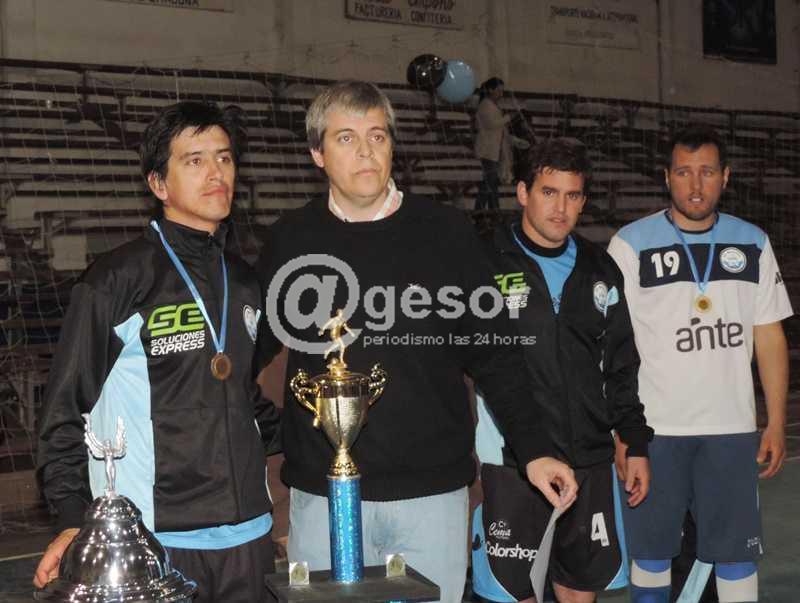 Foto: Claudio Garcilazo, el presidente de Los Abstemios, Andrés Ultra, Guillermo Moranti y el golero Matías Urrutia, durante la celebración de la conquista del torneo de la Liga Regional de Soriano (del archivo de @gesor).