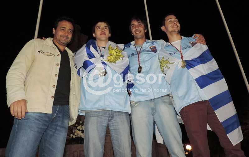 Foto: Rossano Perrone (entrenador), Felipe Spinoglio, Gastón Dufau y Andrés Pintos, durante el homenaje cumplido en Mercedes, tras retornar de México (del archivo de @gesor).