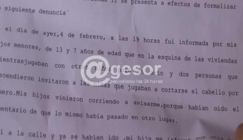 En este sentido, nuestra Agencia de Noticias mantuvo una entrevista con la mamá de dos de los niños involucrados en el hecho, la vecina Carla Suárez, quien expresó que fue informada por sus dos hijos de 7 y 13 años, que en la esquina de las viviendas mientras jugaban con otros niños paró un auto y dos personas que descendieron invitaron a las niñas que jugaban a cortarse el cabello a cambio de dinero.