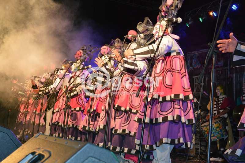 En su nueva presentación la murga subió al escenario de Manzana 20 , con una presentación llena de fuerza precedida de la puesta en escena de Joaquín Montero, que se luce con su potente voz como solista del conjunto de carnaval.