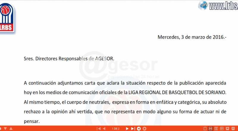 A continuación adjuntamos carta que aclara la situación respecto de la publicación aparecida hoy en los medios de comunicación oficiales de la LIGA REGIONAL DE BASQUETBOL DE SORIANO.