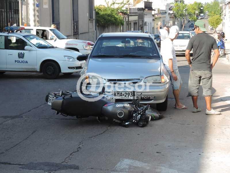 El automóvil marca Daewoo, matrícula KMA-2935, era conducido por un hombre de 52 años, de iniciales E.F., sin licencia de conducir, el que se dirigía por calle Ferreira Aldunate al Oeste, mientras que la moto Yumbo KRC-230, era guiada por un joven de 18 años de iniciales S.C., que viajaba por calle Ituzaingó, también sin licencia de conducir, acompañado por una adolescente de 13 años, que a la postre fue la única lesionada, por lo que debió ser trasladada en ambulancia a centro asistencial. En el lugar trabajó personal policial y de la Brigada de Tránsito de la Intendencia de Soriano.