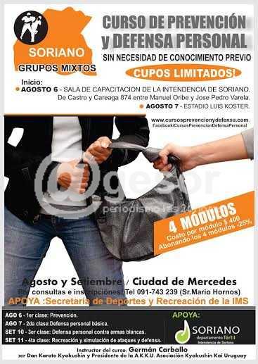 Este curso tiene cupos limitados, se realizará en 4 módulos y tiene un costo de $ 400 por módulo. Tiene por objetivo brindar las herramientas para prevención y la defensa personal, y es apoyado por la Intendencia de Soriano a través de la Secretaría de Deportes.