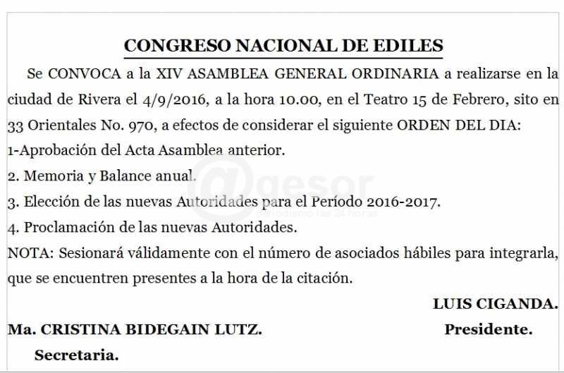 Se CONVOCA a la XIV ASAMBLEA GENERAL ORDINARIA a realizarse en la ciudad de Rivera el 4/9/2016, a la hora 10.00, en el Teatro 15 de Febrero, sito en 33 Orientales No. 970, a efectos de considerar el siguiente ORDEN DEL DIA: