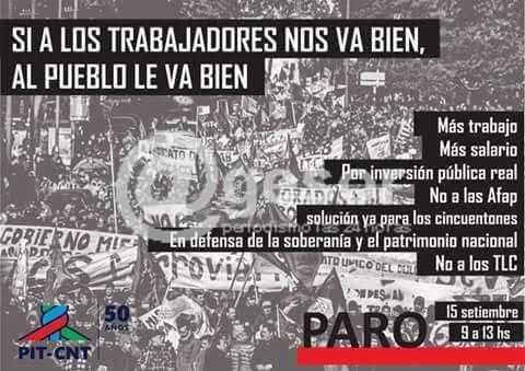 "El jueves 15 de septiembre, en el marco del PARO GENERAL PARCIAL A NIVEL NACIONAL DEL PIT CNT llamamos a todos los trabajadores a adherirse a la medida de paro de 9 a 13 horas.