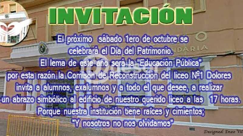 Este sábado 1 de octubre se celebra el Día del Patrimonio, como se ha informado. El lema de este año es la "Educación Pública", por esta razón, la comisión de Reconstrucción del Liceo 1 de Dolores, "invita a alumnos, exalumnos y a todo el que desee, a realizar un abrazo simbólico al edificio de nuestro querido liceo a las 17.00 horas.