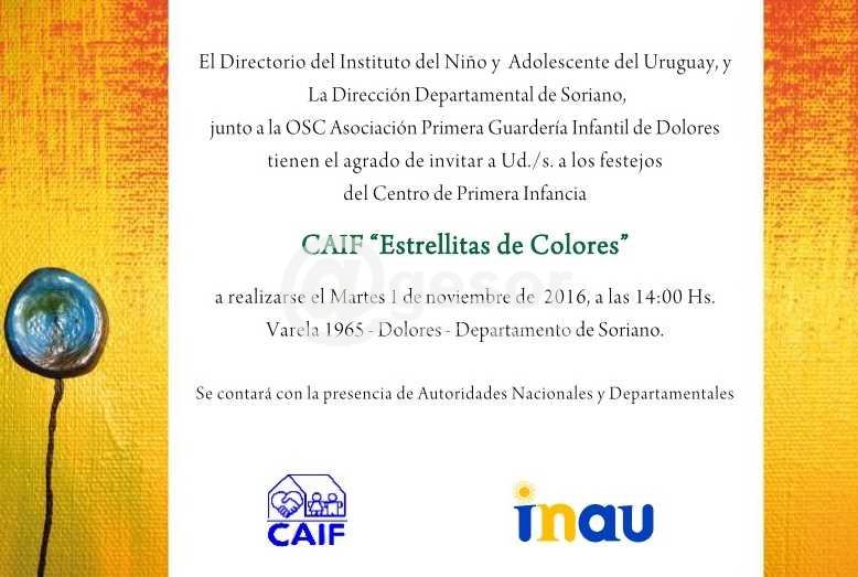 El Directorio del INAU y la Dirección Departamental de Soriano , junto a la OSC Asociación Primera Giardería Infantil de Dolores están invitando a los festejos de del Centro de Primera Infancia CAIF "Estrillitas de Colores", a realizarse este martes 1 de noviembre a las 14.00 horas en Varela 1965, Dolores.