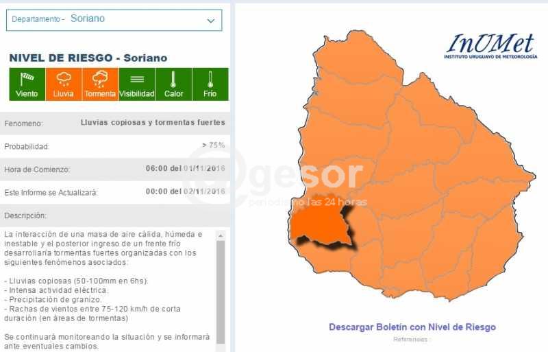 El Instituto Uruguayo de Meteorología (Inumet) emitió en la tarde del lunes una alerta de color naranja que regirá desde las 6 de la mañana hasta las cero horas del miércoles y afectará a todos los departamentos del país.