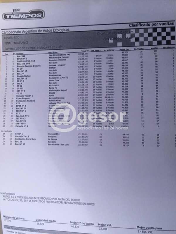 La carrera tuvo como ganador a la Escuela Técnica Nro. 292 de San Vicente, Santa Fe, seguida sucesivamente por los siguientes establecimientos: (2do lugar) EPET Nro. 5 de Macachín La Pampa, (3er. lugar) Instituto Politécnico 418 de Posadas Misiones, (4to. lugar) Escuela Industrial DFS de San Juan y (5to lugar) Escuela Técnica Dolores de Soriano, Uruguay.