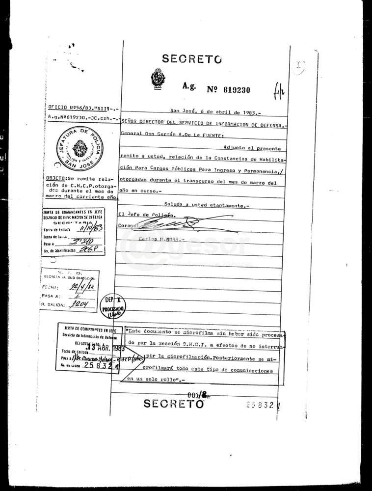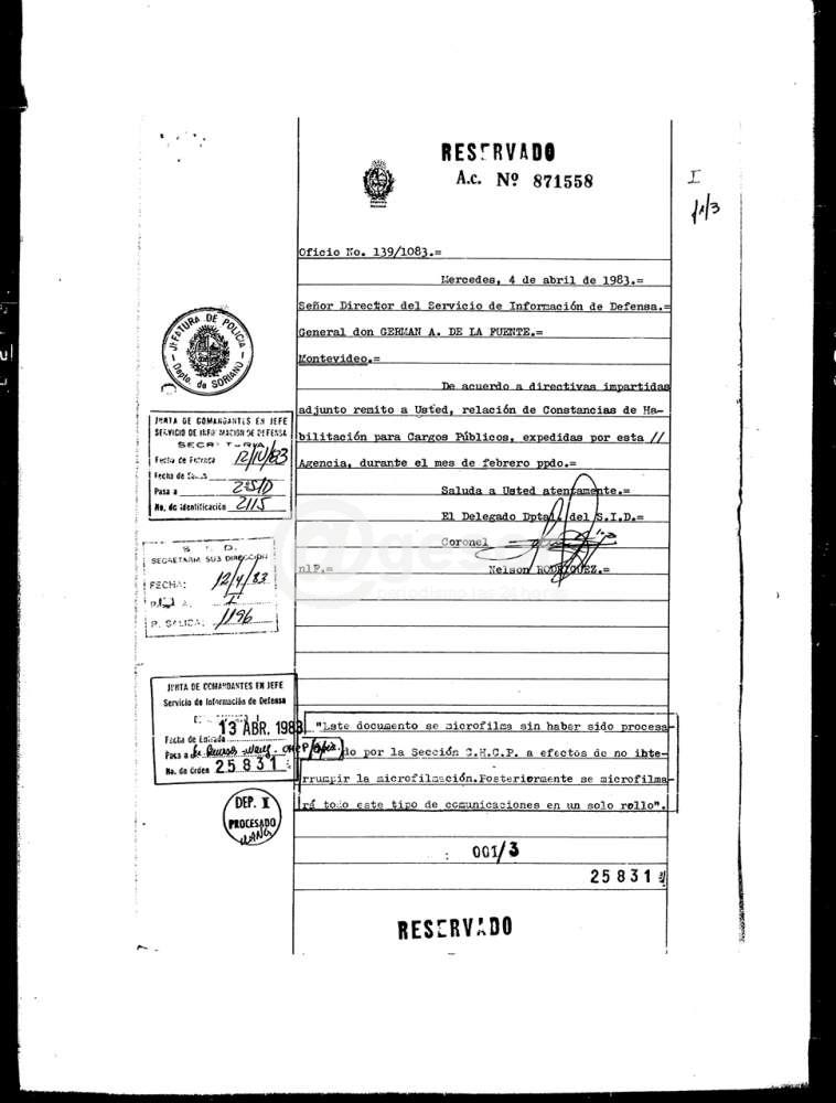 Documentos de la época revelan estos procedimientos que si bien no son una novedad corroboran lo que es parte del anecdotario popular. @gesor accedió a alguno de esos documentos militares que reflejan esa perversidad por espiarlo todo. Hechos que ocurrieron durante todo el período dictatorial. A modo de ejemplo el 4 de abril de 1983, el Coronel Nelson Rodríguez, Delegado departamental del SID (Servicio de Información de Defensa), informaba al general Germán de la Fuente sobre la “relación de Constancias de habilitación para cargos públicos, expedidos por esta agencia, durante el mes de febrero ppdo”. Detallando como lo reflejan las fotografías que acompañan esta nota, la nómina de mercedarios que habían iniciado trámites para ingresar a la UTE, OSE, Banco República. Optamos por proteger la identidad de estas personas pues este artículo pretende hacer foco en el espionaje sistemático a que eran sometidos los ciudadanos y no distraer la atención en otras cuestiones.