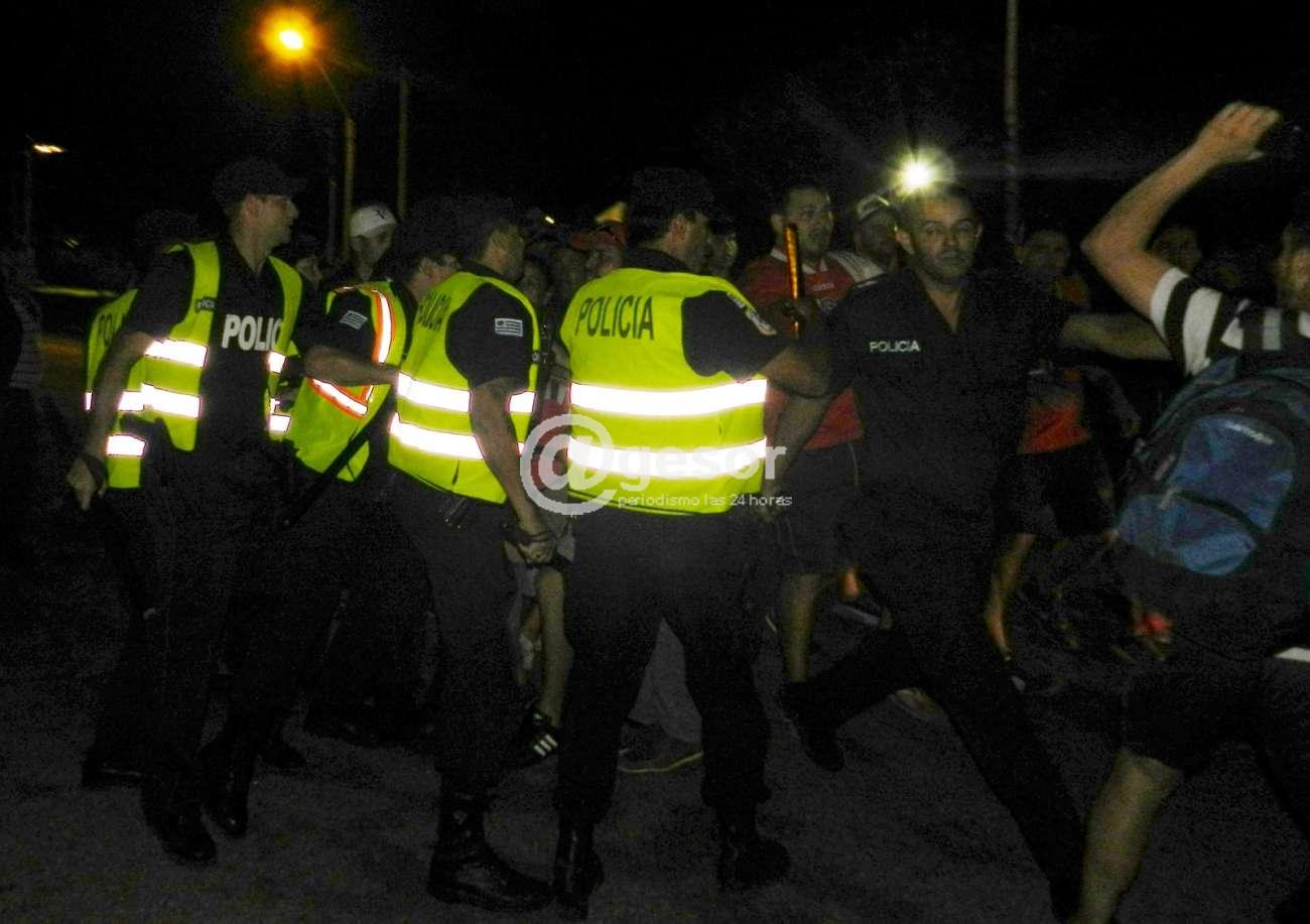 Primero se dio salida al ómnibus más afectado, allí debido a que varios de los hinchas estaban ebrios hubo algunas corridas y altercados con policías que trataban de hacerles entender que subieran al coche para ser escoltados y retirarlos hasta que lo lograron. El coche con sus choferes fue llevado a la seccional 2a. para realizar la denuncia correspondiente.