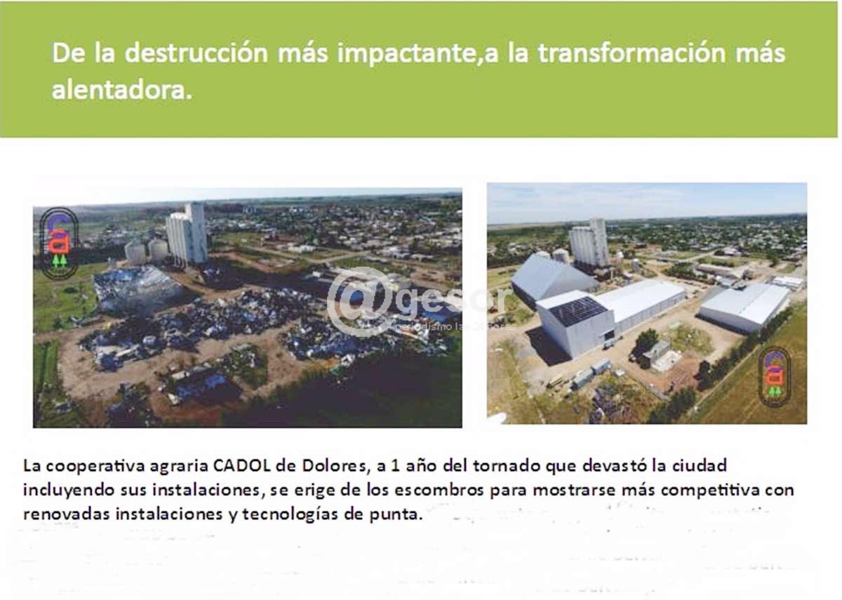 La cooperativa agraria CADOL, a un año del tornado que devastó la ciudad incluyendo sus instalaciones, “se erige de los escombros para mostrarse más competitiva con renovadas instalaciones y tecnologías de punta. CADOL junto a CAF comparte estos logros de una empresa cooperativa uruguaya que a pesar de todo nunca dejó de funcionar".