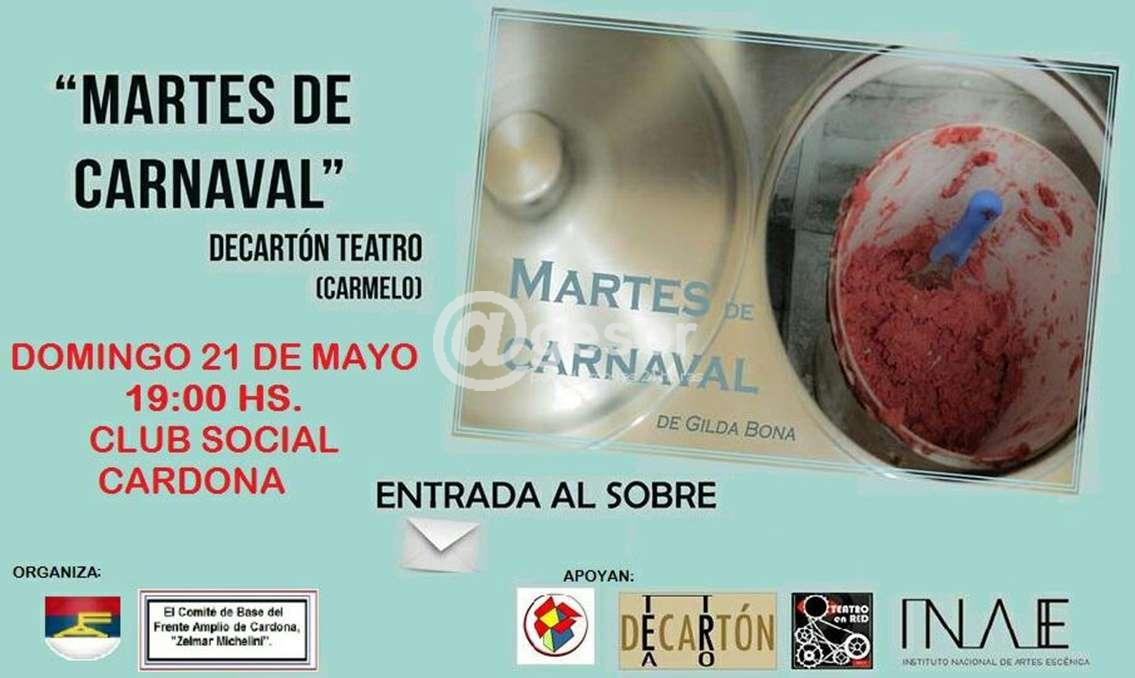 Este domingo 21 de mayo el grupo “Decartón Teatro” presentará en el Club Social Cardona la obra “Martes de Carnaval”. Esta actividad cultural es organizada por el Comité del Frente Amplio de Cardona, en el marco de un nuevo aniversario de la muerte de Zelmar Michelini.
