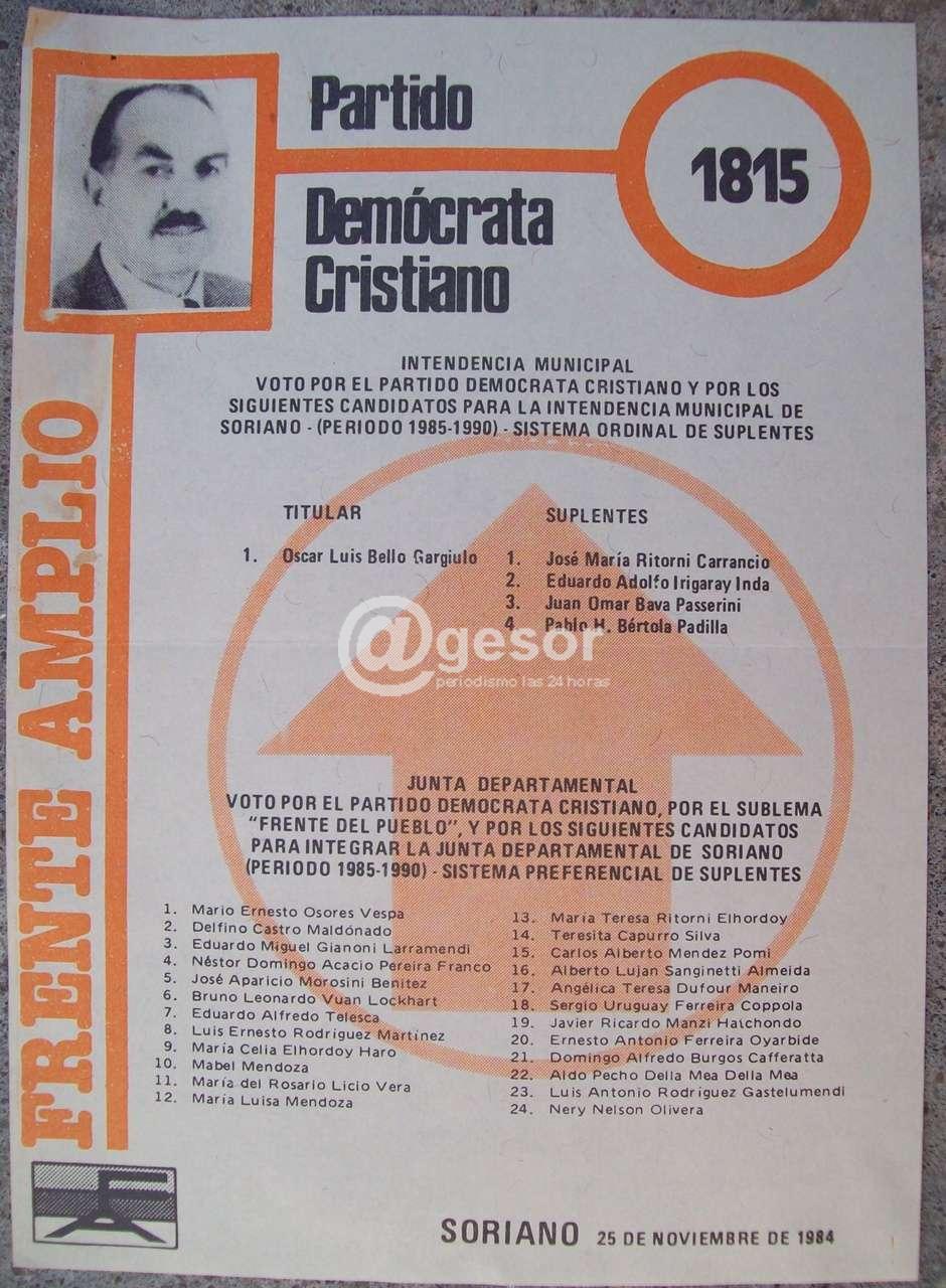 Oscar Bello, personalidad reconocida en el medio y comprometido con esta fuerza política, desde su creación, fue Presidente del Frente Amplio de Soriano durante varios períodos, candidato a Intendente y miembro de la Mesa Política Nacional.