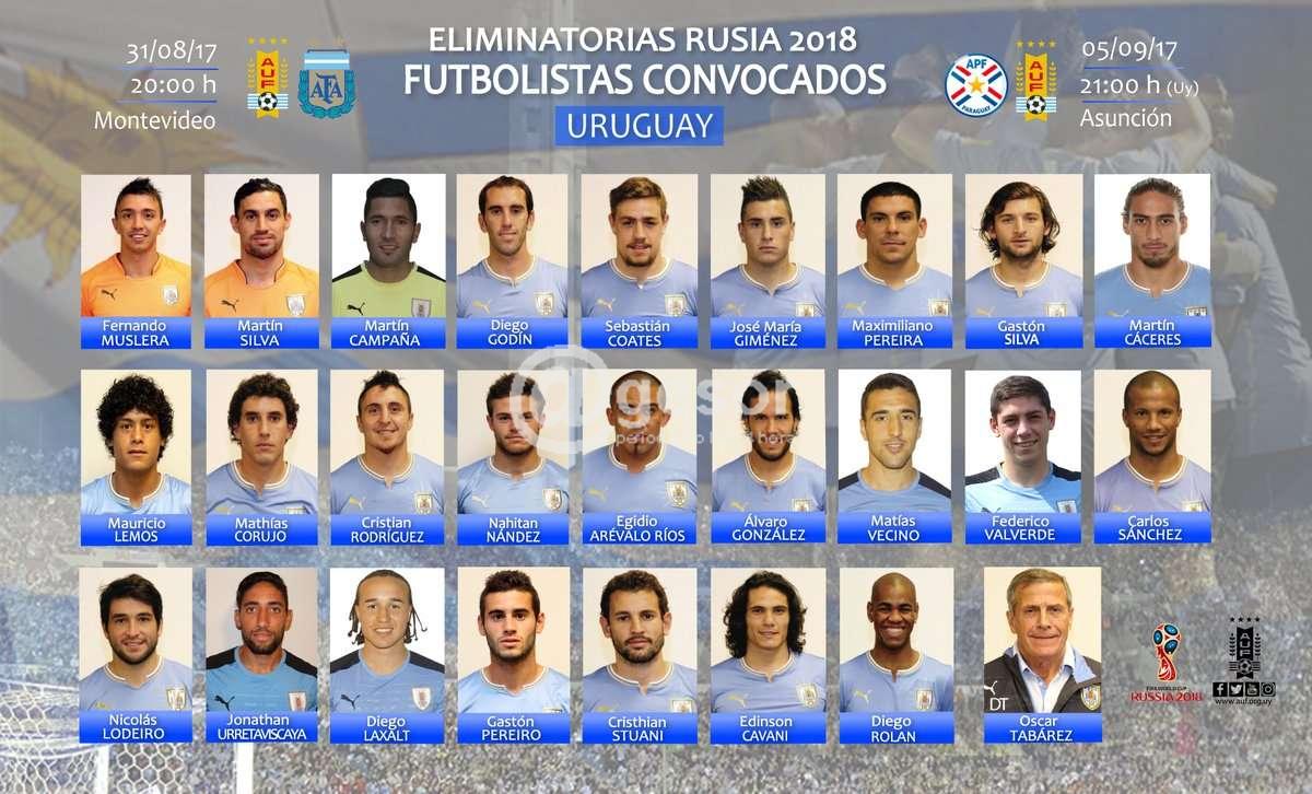 La nómina que encabeza el goleador de París Saint Germain Edinson Cavani la integran: Fernando Muslera, Martín Silva y Campaña (arqueros); Diego Godín, Sebastián Coates, José María Giménez, Maximiliano Pereira, Silva, Martín Cáceres, Mauricio Lemos y Corujo (defensores).