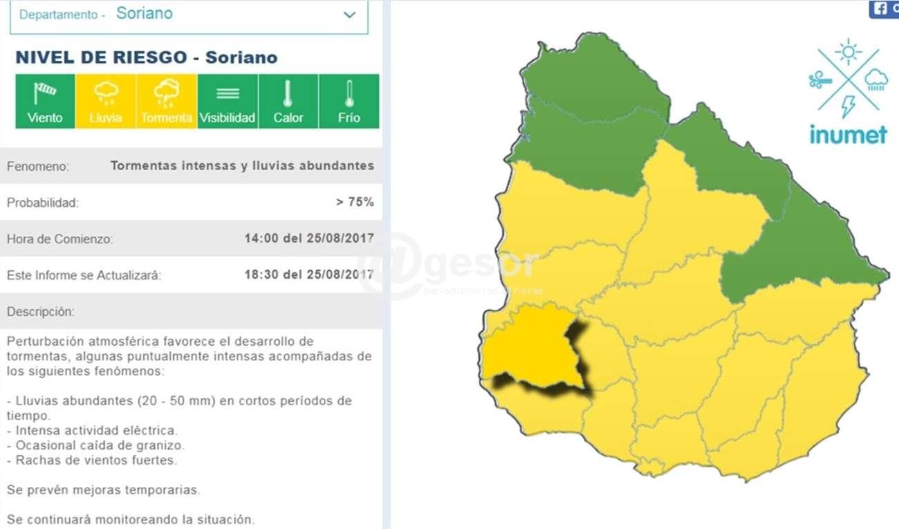 INUMET emitió nueva actualización del pronóstico meteorólgico a partir de las 14.00 horas y hasta las 18.30. En el caso de Soriano como en la mayoría del país, pasó de naranja a amarilla la advertencia por perturbación atmosférica que favorece el desarrollo de tormentas, algunas puntualmente intensas, acompañadas de lluvias abundantes de 20 a 50 mm en cortos períodos de tiempo, intensa actividad elécrica, ocasional caída de granizo, rachas de vientos fuertes. Se prevén mejoras temporarias.