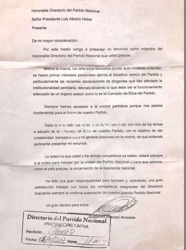 El texto dirigido al Presidente del Directorio, Luis A. Heber, expresa "por este medio vengo a presentar a mi renuncia como miembro del Honorable Directorio del Partido Nacional que usted preside".