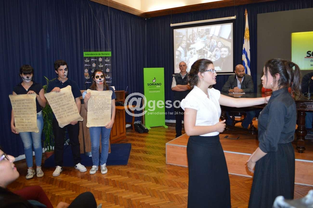 En la oportunidad estudiantes liceales dirigidos por la docente María Ingold realizaron representación sobre la igualdad de género y también cantaron tema alusivo a ello, lo que fue muy aplaudido por los asistentes.