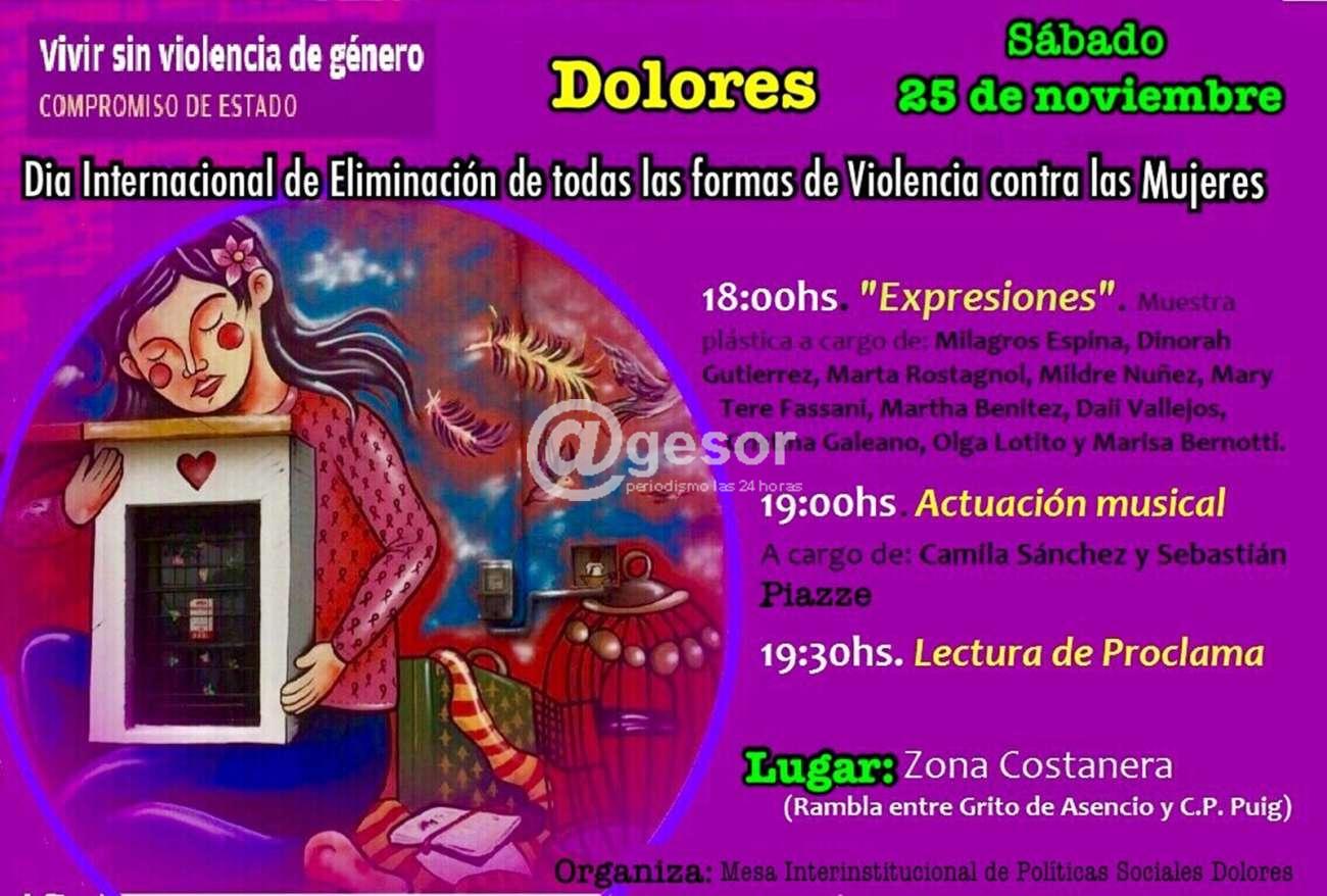 Con la organización de la Mesa Interinstitucional de Políticas Sociales de Dolores está organizando en la zona costanera, en la rambla entre Grito de Asencio y C. P. Puig, actividades a partir de las 18.00 horas comenzando con "Expresiones", muestra plástica a cargo de Milagros Espina, Dinorah Gutiérrez, Marta Rostagnol, Mildre Núñez, Mary Tere Fassani, Martha Benítez, Dall Vallejos, Cristina Galeano, Olga Lotito y Marisa Bernotti.