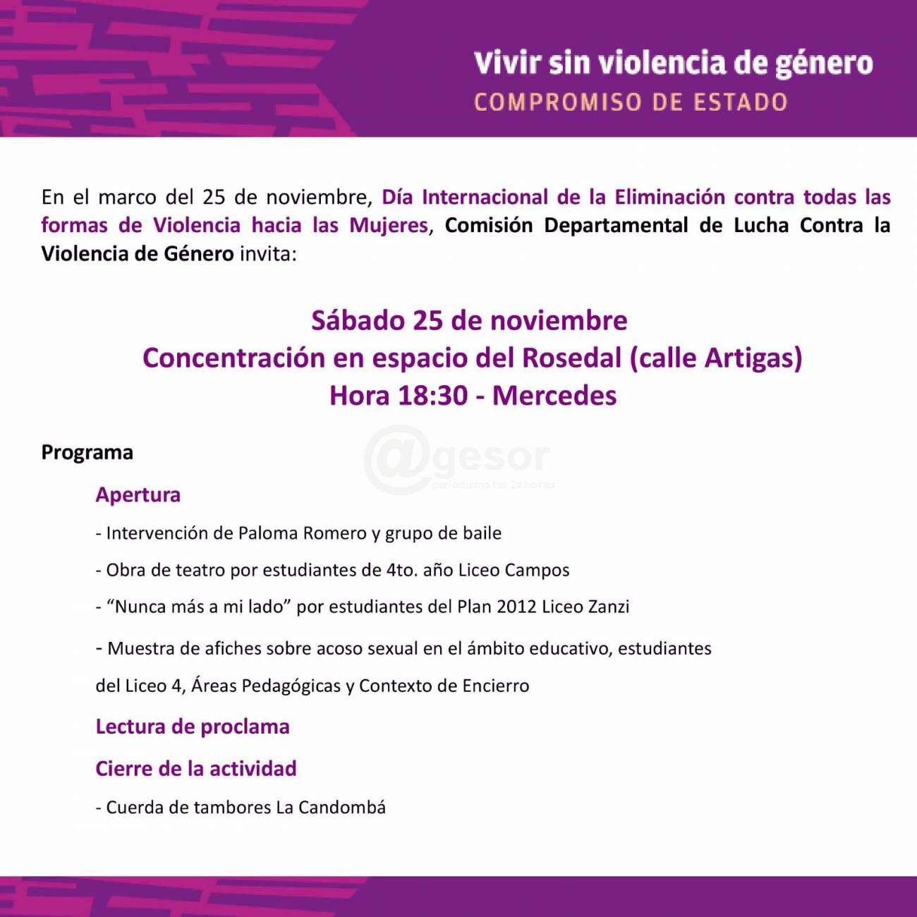 En Mercedes el próximo sábado desde la hora 18.30, habrá una concentración sobre la rambla en el espacio contiguo a la plaza del Rosedal (Calle Artigas), con actuación de artistas locales y lectura de Proclama.