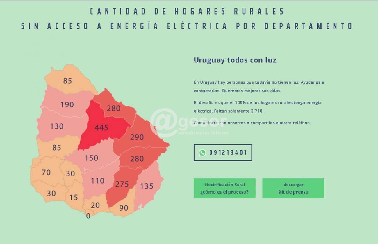 “En Uruguay hay personas que todavía no tienen luz. Ayudanos a contactarlas. Queremos mejorar sus vidas”, expresa el comunicado emitido por la Oficina de Planeamiento y Presupuesto. “ El desafío es que el 100% de los hogares rurales tenga energía eléctrica. Faltan solamente 2.710. Comunicate con nosotros o pasales nuestro WhatsApp: 091219401. Este Programa está impulsado por la Comisión Interinstitucional de Electrificación Rural (CIER). La CIER está integrada por: OPP, MGAP, MIDES, MIEM, MVOTMA, UTE, ANTEL, INC y MEVIR”.