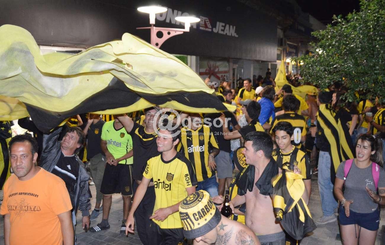 La barra Mercedes que se reúne en Ferrería y Artigas, junto a hinchas que se unieron desde distintos puntos de la ciudad, caminaron por la zona céntrica rumbo a la rambla mercedaria cantando la alegría por el título.