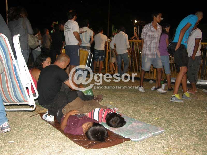 Un hecho significativo en la semana que pasó fue la masiva concurrencia de público que noche a noche llenó el amplio predio de la Manzana 20, donde las familias disfrutaron de los espectáculos en un ambiente de distendida camaradería. Personas mayores con sus sillas plegables, junto a jóvenes que sentados en el pasto aplaudían a sus conjuntos predilectos. Niños corriendo o jugando en absoluta libertad. O como lo registra esta fotografía, una pareja escuchando atenta el desarrollo de la actuación de la Murga doloreña 7 y 3, mientras sus hijos, en un par de colchonetas, duermen apaciblemente, ajenos a todo.