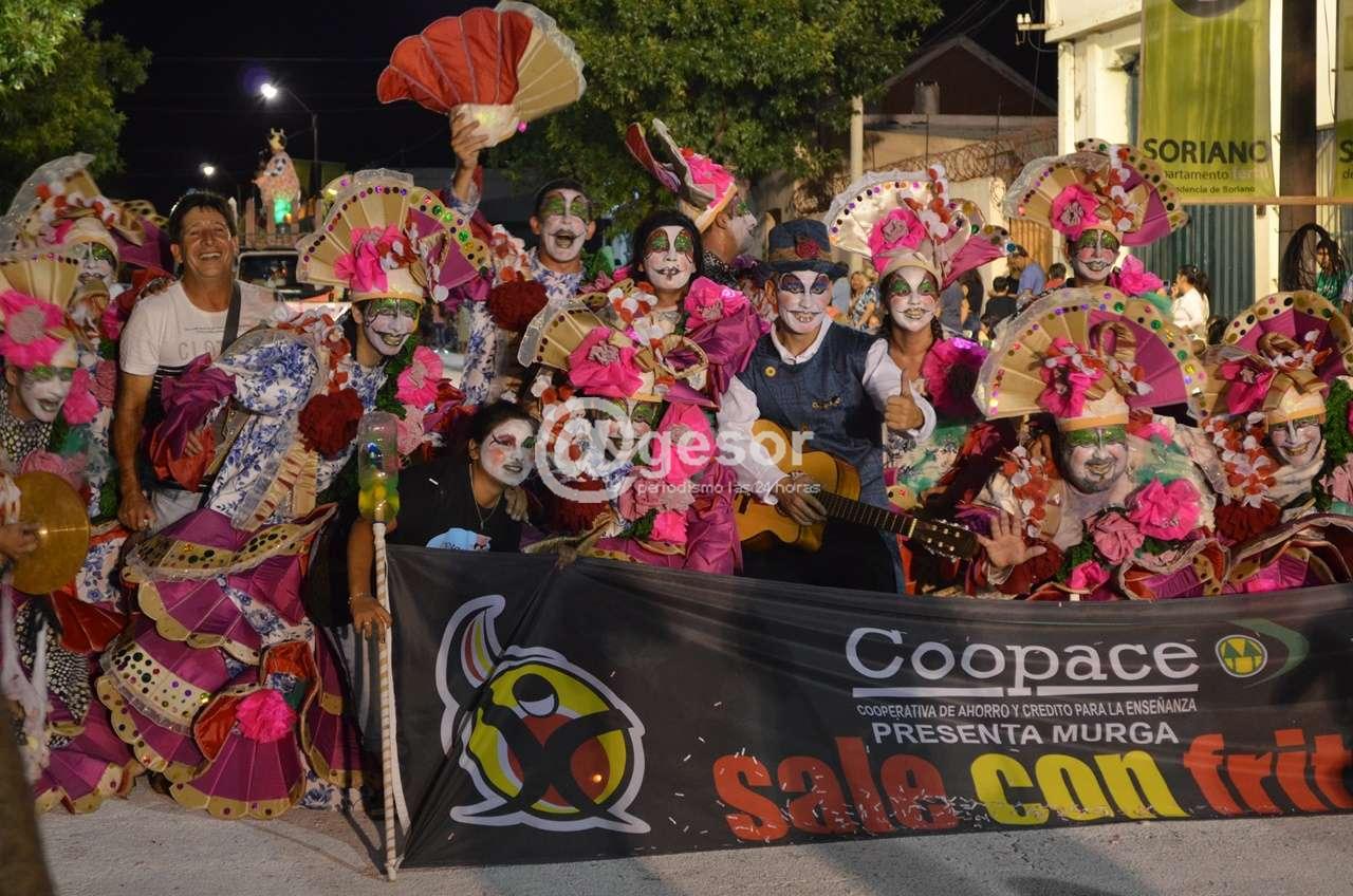 Dando seguimiento al desfile inaugural del Carnaval de Soriano se inicia el pasaje de las agrupaciones sorianenses que competirán en los concursos de las diferentes categorías, haciéndolo en primer lugar la murga "Sale con Fritas" de Mercedes fundada en el 2016, cuyos directores responsables este año son Kevin Valvé y Sebastián Rosso, con la propuesta que presenta en este 2018, denominada "Inframurga", y tiene su lugar de ensayo en la sede del Mercedes Rovers F.C.