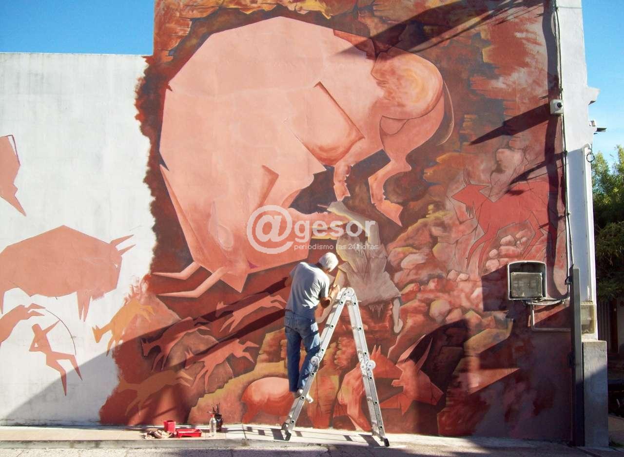 Los artistas locales Angel Juárez y Enrique Rey desde hace algunos días vienen trabajando en esta obra que pretende ser un homenaje a las pinturas rupestres de Altamira. Se trata de una obra de la autoría de Juárez con la activa colaboración de Rey. La obra ocupará toda la pared lateral de la zona de estacionamiento de la Intendencia de Soriano, y que ya comenzó a tomar color a impulso del trabajo de estos dos artistas, quienes por las dimensiones de la superficie estiman les llevará varios días de trabajo poder completarla.