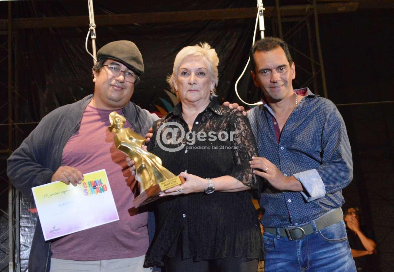 4- José María Bertullo recibe trofeo de manos de Olga Galeano y Julio Pozzolo Galeano, esposa e hijo de Titonga Pozzolo, como mejor texto del Carnaval