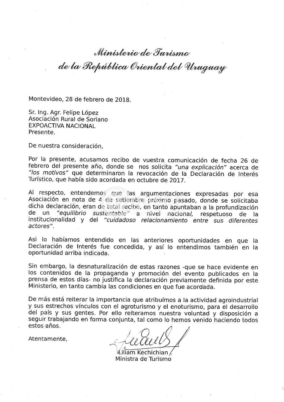El texto de la carta enviada al Presidente de la ARS, Ing. Agr. Felipe López expresa: "Por la presente, acusamos recibo de vuestra comunicación de fecha 26 de febrero del presente año, donde se nos solicita "una explicación" acerca de "los motivos" que determinaron la revolcación de la Declaración de Interés Turistico, que había ido acordada en octubre de 2017.