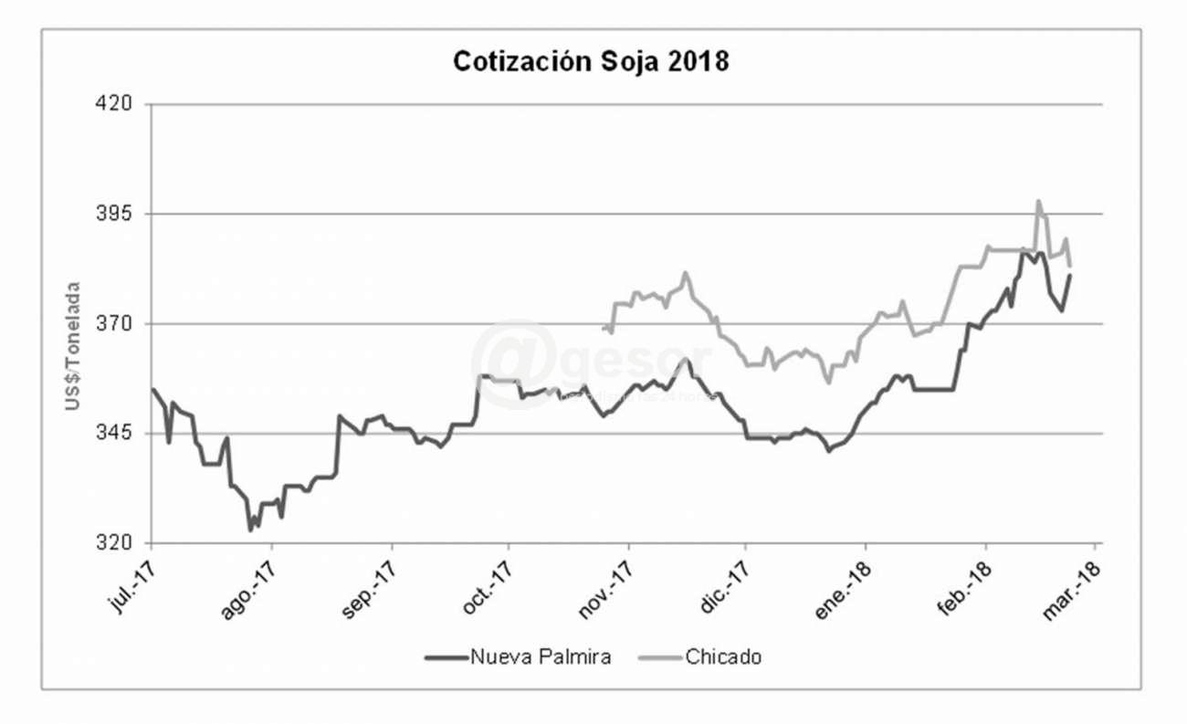 A nivel local, la cotización de la oleaginosa puesta en Nueva Palmira con entrega a mayo alcanzó un máximo de US$/t 387 a principios de marzo y luego se estabilizó en US$/t 375-380. Esto representa una valorización de 6,5% desde que comenzó a operar el contrato, en julio del año pasado. La cotización mínima, la soja la registró a mediados de agosto de 2017 (US$/t 323) y desde entonces se valorizó 15% hasta la fecha. El viernes la cotización que se manejaba para la oleaginosa a nivel local era de US$/t 380, puesta en Nueva Palmira.